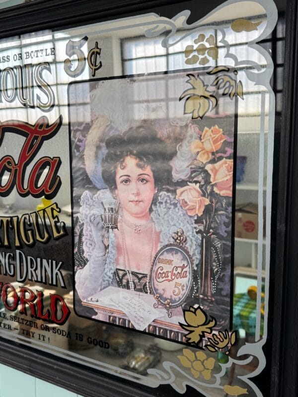Specchio pubblicitario vintage della Coca-Cola dall’aspetto autentico, raffigurante una classica signora in stile vittoriano che regge un bicchiere di Coca-Cola e l’iconico slogan: “La deliziosa