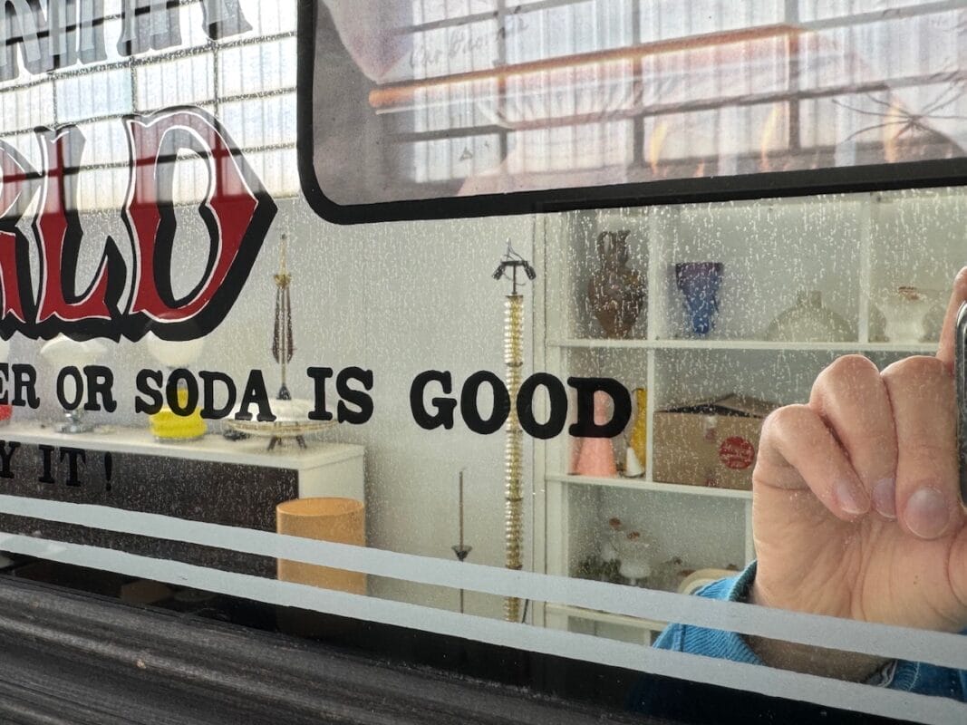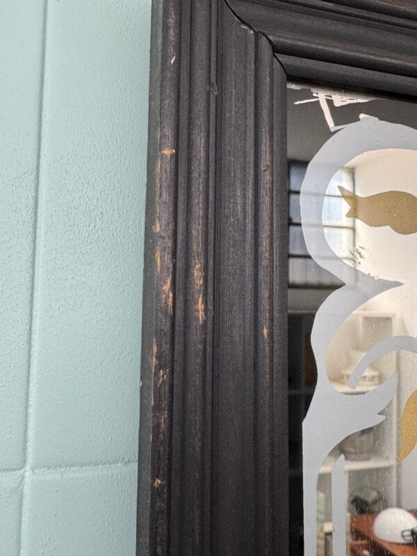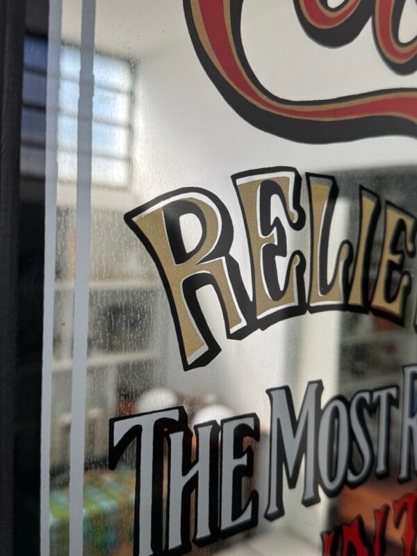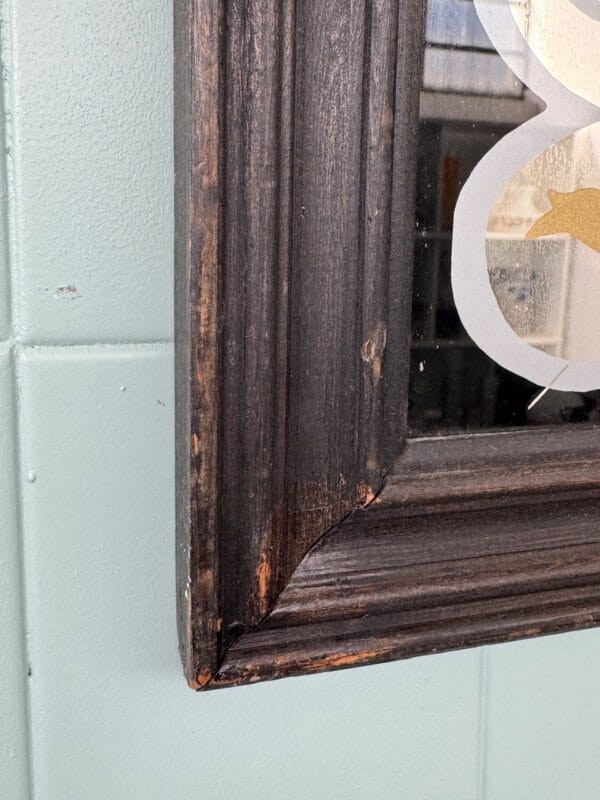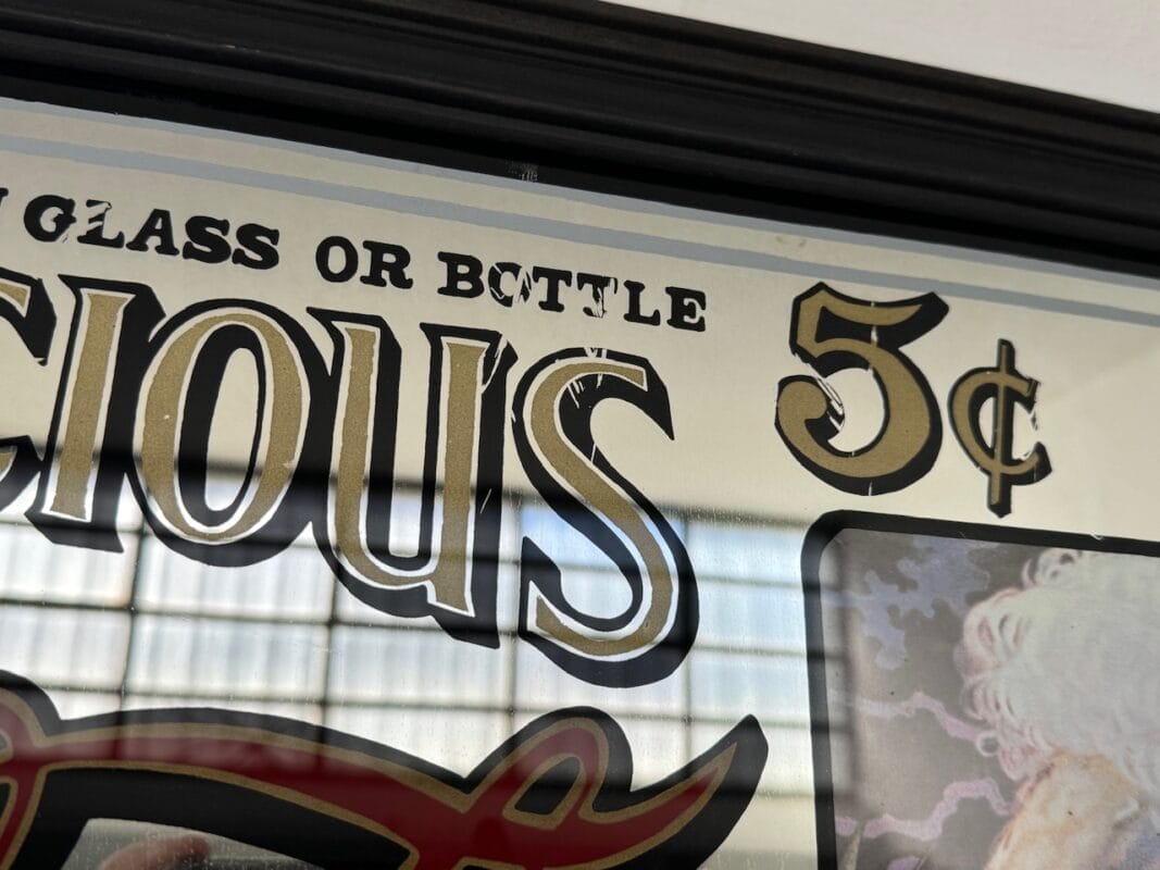 Questo specchio da parete con cornice imita la pubblicità di inizio XX secolo (riproduzione degli anni ’70-’80 circa basata sul design originale degli anni 1890-1900).
