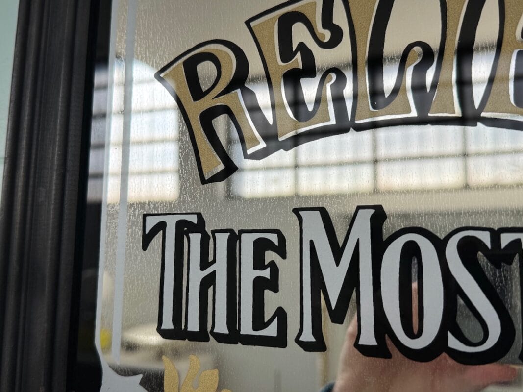 E stampato in oro, rosso e nero, con una tipogratia in rilievo e una cornice floreale sul vetro.