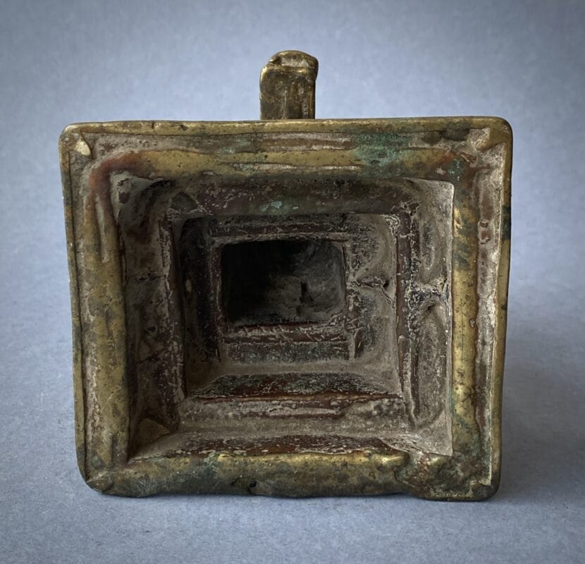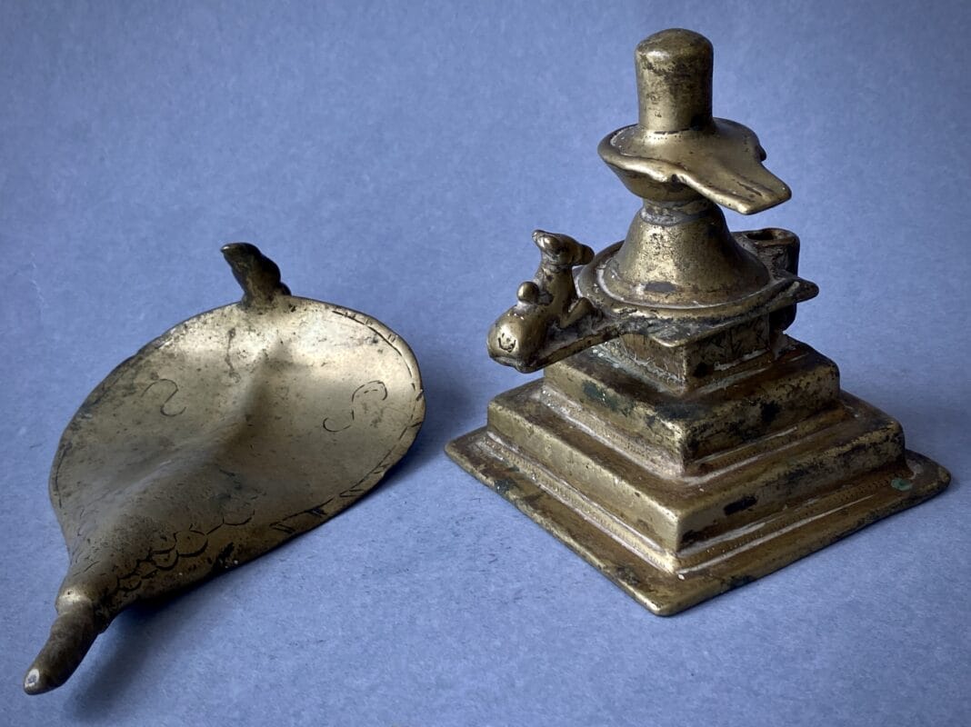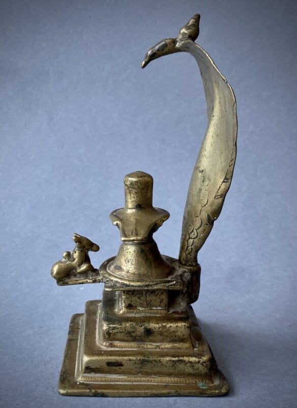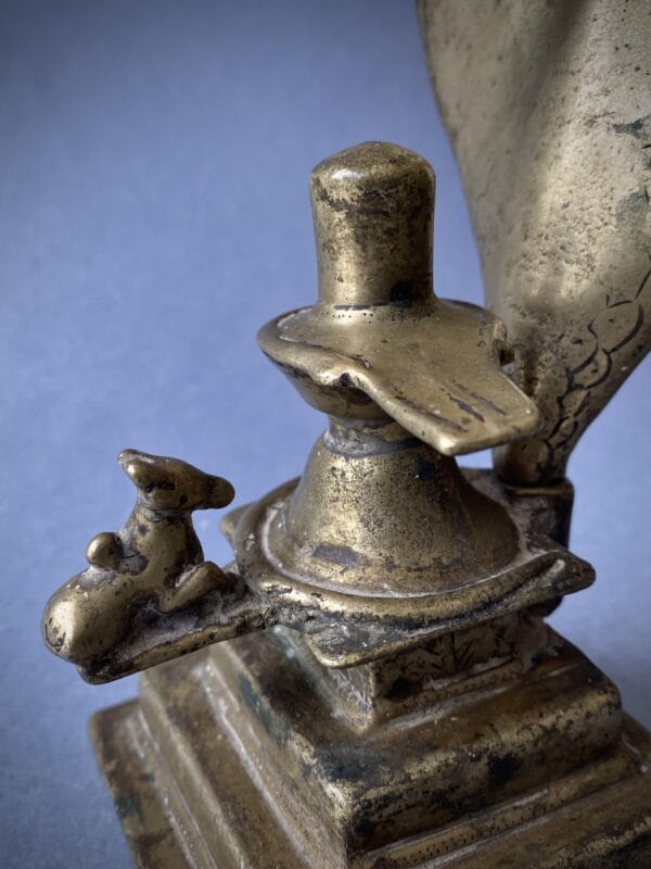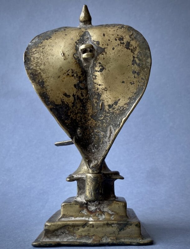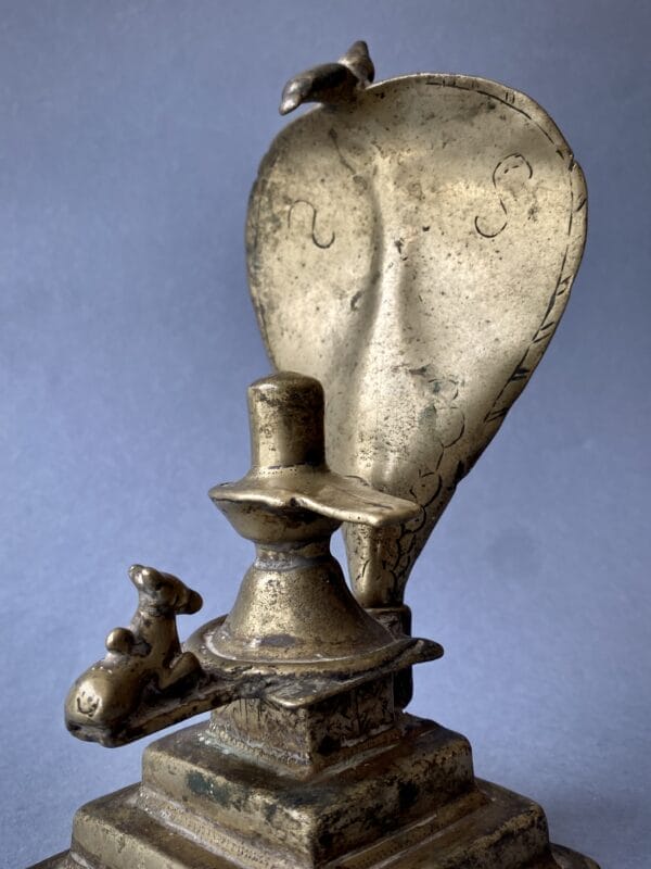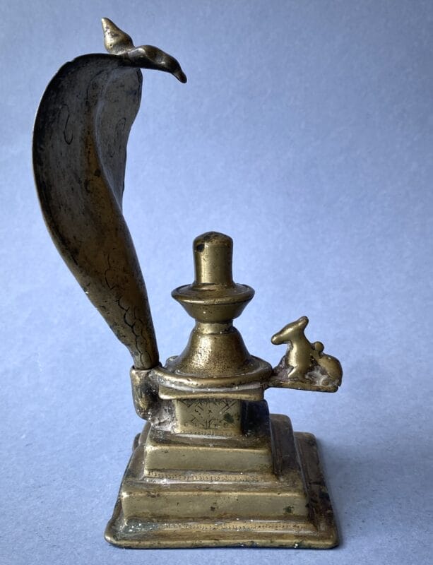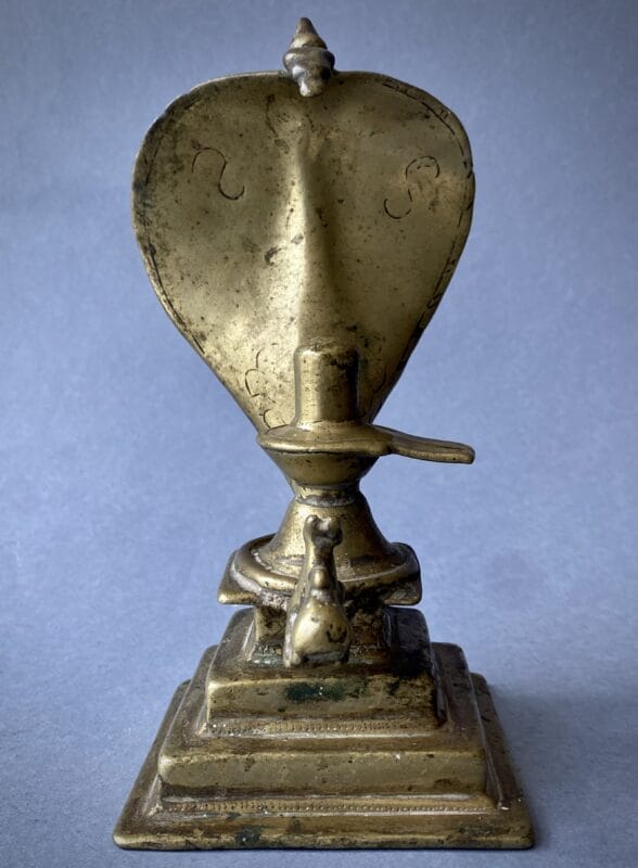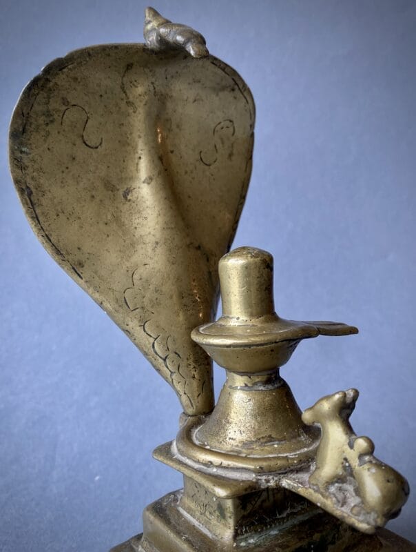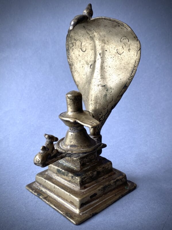 L’iconografia e la funzione sono pienamente śaive: il complesso liṅga-yoni materializza l’unione Śiva-Śakti, Nandī esprime la devozione e la mediazione del fedele, il Nāga ne custodisce la potenza. La complessa raffigurazione nasce per la pūjā domestica, come attestano la patina scura da oli e unguenti, le lucidature da sfregamento e le minute incrostazioni coerenti con l’uso cultuale. Stilisticamente il pīṭha a gradoni con cornici puntinate, il piccolo Nandī tozzo sul prolungamento anteriore e l’ampio cappello serpentiforme rimandano alle fusioni popolari del Deccan tardo-settecentesco, robuste e “materiche”, ma attente al dettaglio inciso. Stato di conservazione complessivamente buono, con normali abrasioni ai bordi e leggere deformazioni al profilo del cappello del nāga.