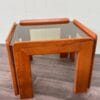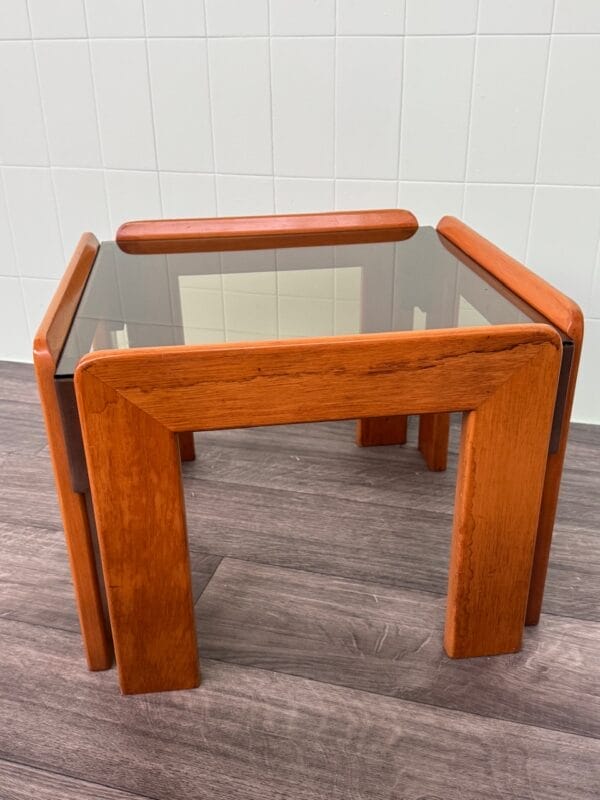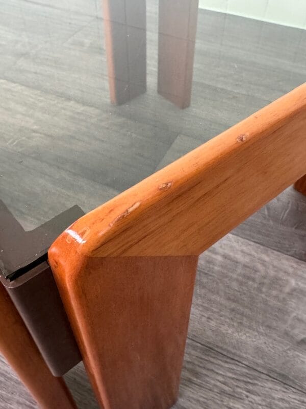 caratterizzato da linee semplici ma sofisticate, in perfetta sintonia con l’estetica dell’epoca. Realizzato in legno di faggio, il tavolino presenta una struttura solida e al contempo leggera. Il piano in vetro fumè, dalle forme geometriche essenziali, è rifinito con grande attenzione ai dettagli, mentre la superficie in legno, curata e liscia, esprime calore e raffinatezza. L’uso del legno, materiale naturale e durevole, è esaltato dalla maestria del produttore che ha saputo coniugare funzionalità ed eleganza in un oggetto che diventa al contempo un pezzo d’arredo e una dichiarazione di stile.