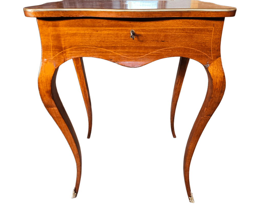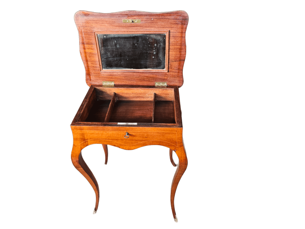 TAVOLINO DA LAVORO IN RADICA DI NOCE LUIGI FILIPPO EPOCA XIX SECOLO INTERNO IN PALISSANDRO E SPECCHIO ORIGINALE CORRETATI DA FILETTATURA IN OTTONE SERRATURA E CHIAVE ESEGUITO RESTAURO FINITO A GOMMALACCA PRONTO DA USARE.