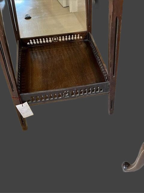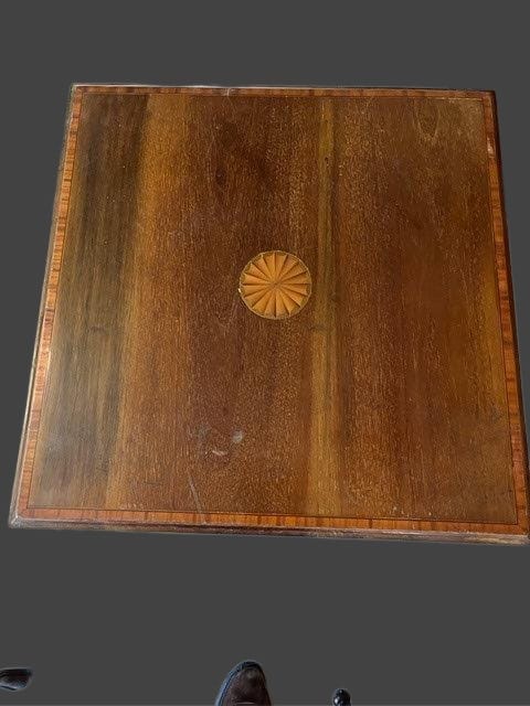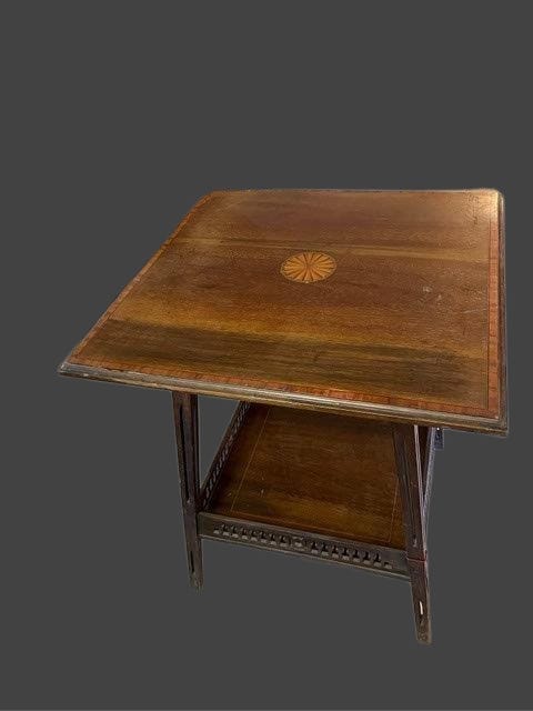 Tavolino rettangolare in mogano con due ripiani, finemente intarsiato in bois de rose e legni vari.