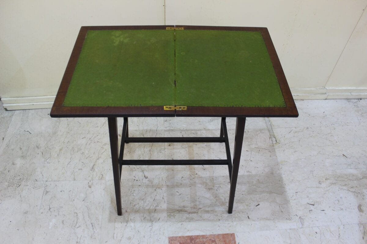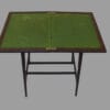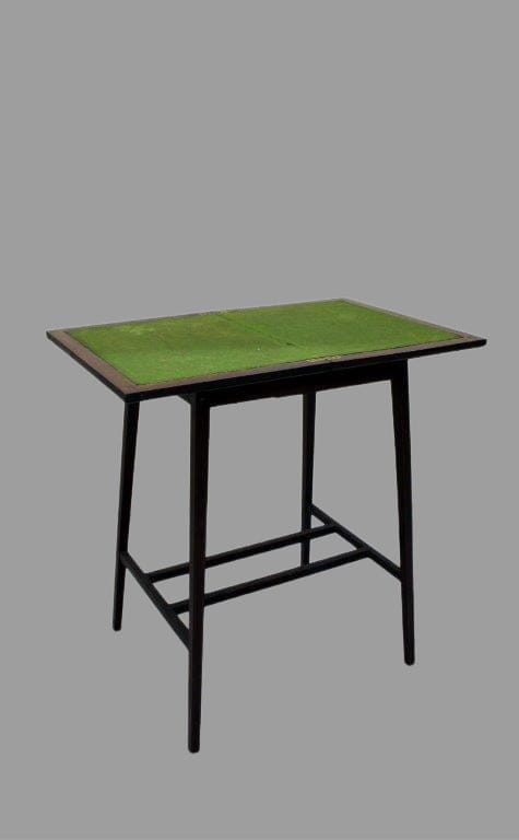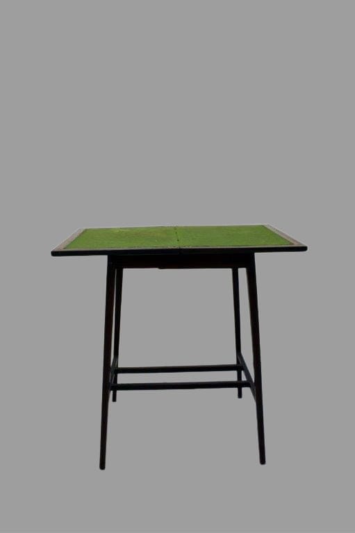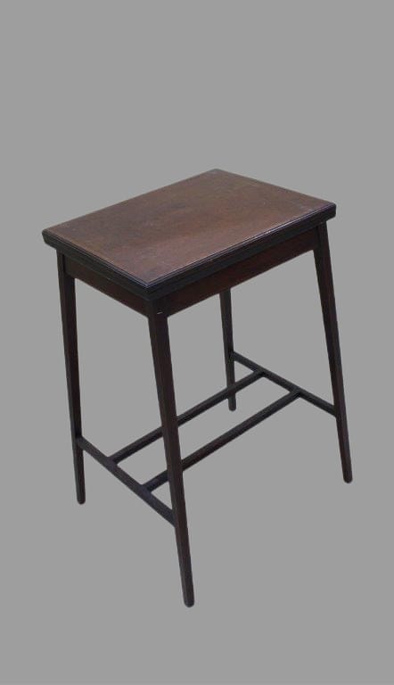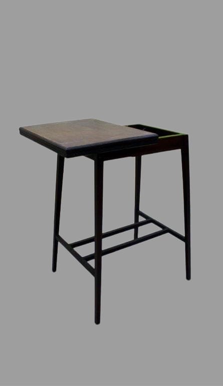 Tavolino con quattro gambe sottili raccordate da una crociera, piano rettangolare apribile filettato in legno chiaro celante piccolo vano interno.