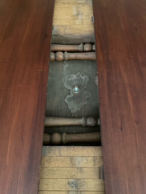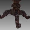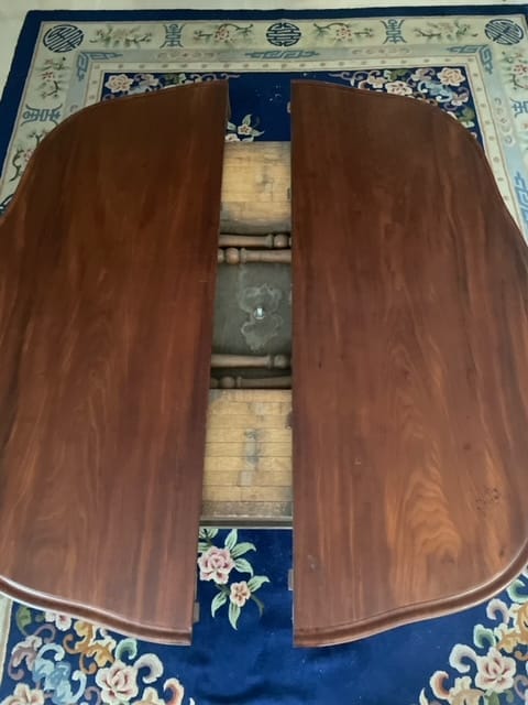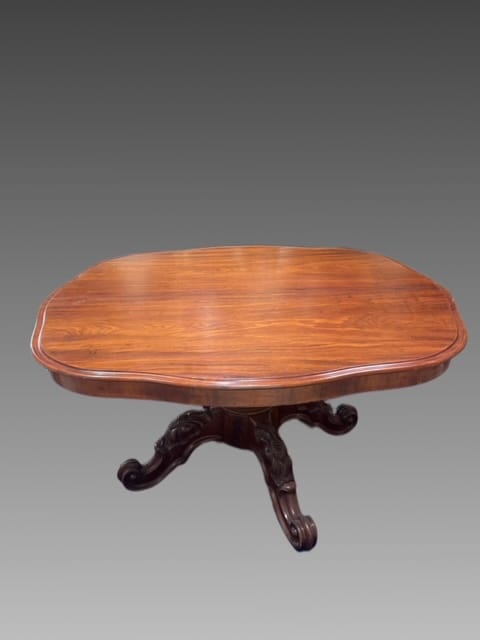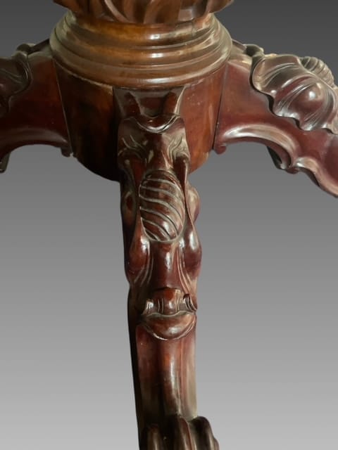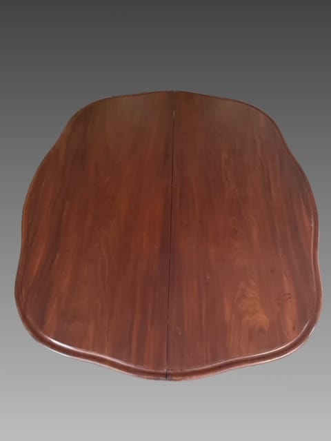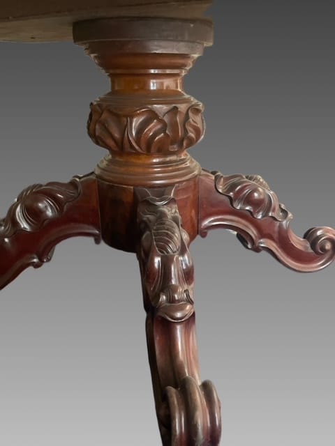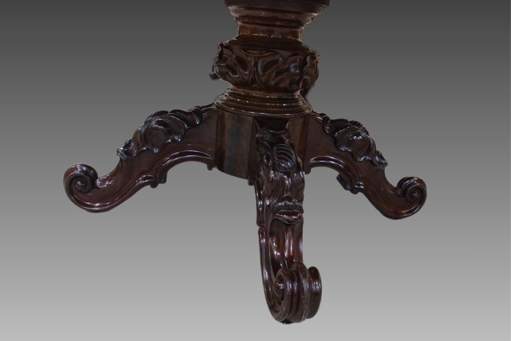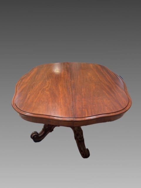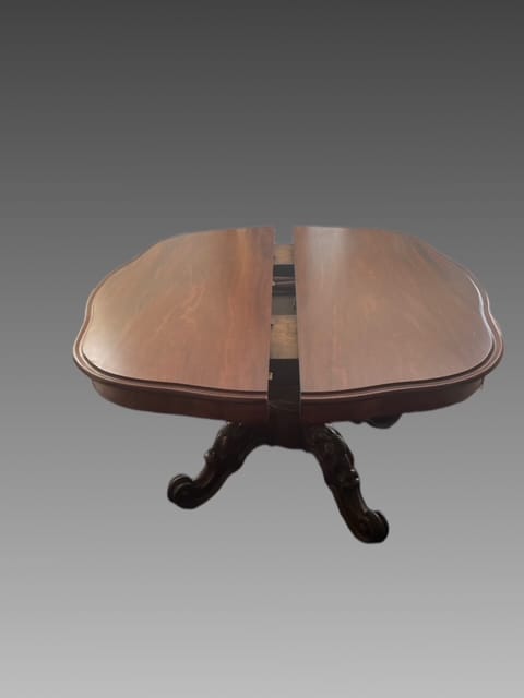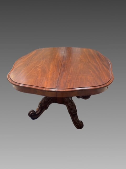 Tavolo allungabile in mogano con piede centrale finemente intagliato con piano apribile e mosso.