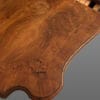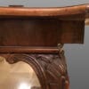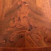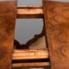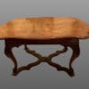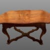 TAVOLO ALLUNGABILE IN NOCE, PIANO SAGOMATO FINEMENTE INTARSIATO POGGIANTE SU BASA A QUATTRO GAMBE INTAGLIATE.