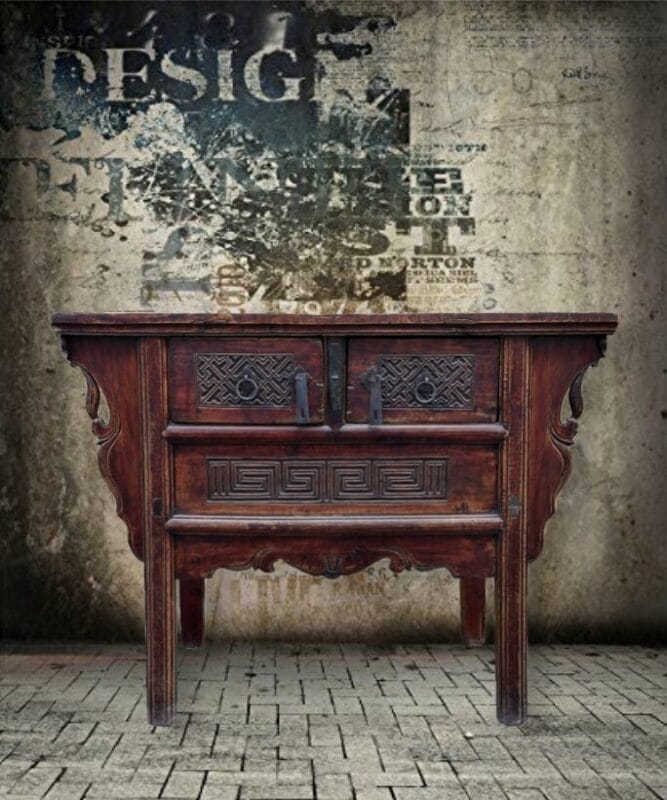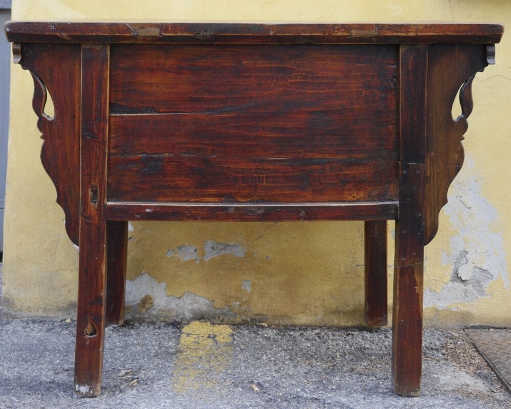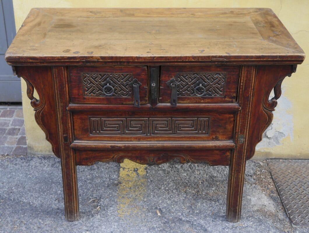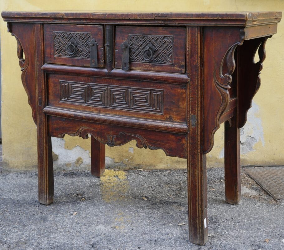 Bellissimo tavolo altare in legno massello lavorato a mano e utilizzato come altare di famiglia o santuario degli antenati.
