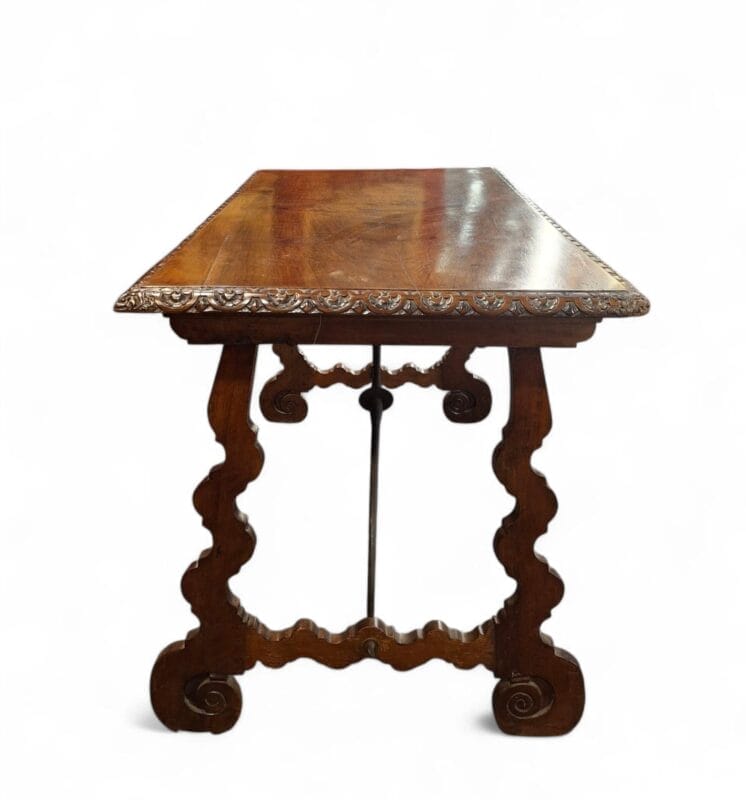 Tavolo con gambe a lira in legno di noce, ferro di supporto centrale, Spagna, fine XVII secolo, profilatura del piano intagliato con 4 mascheroni, misure 75×130 cm, altezza 82 cm.