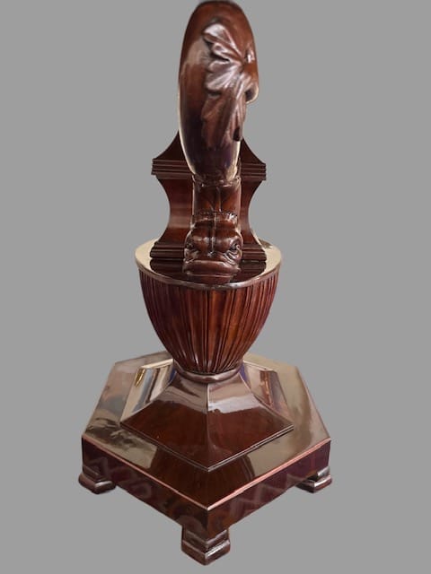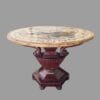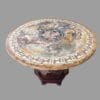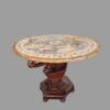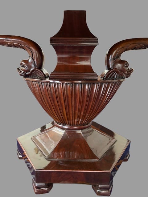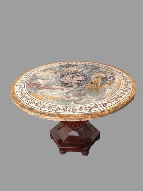 Tavolo con piano in scagliola raffigurante scena neoclassica datato ” 1832 ” sorretto da delfini poggianti su base centrale a forma di vaso in legno di mogano.