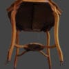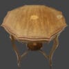 Tavolo in mogano con intarsi in legni vari. Piano ottagonale mosso poggiante su quattro gambe raccordate da un pianetto inferiore. Inghilterra, XIX Secolo.