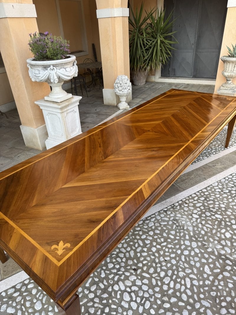 Tavolo rettangolare fisso in noce con gambe a spillo e intarsi in ottime condizioni di mantenimento