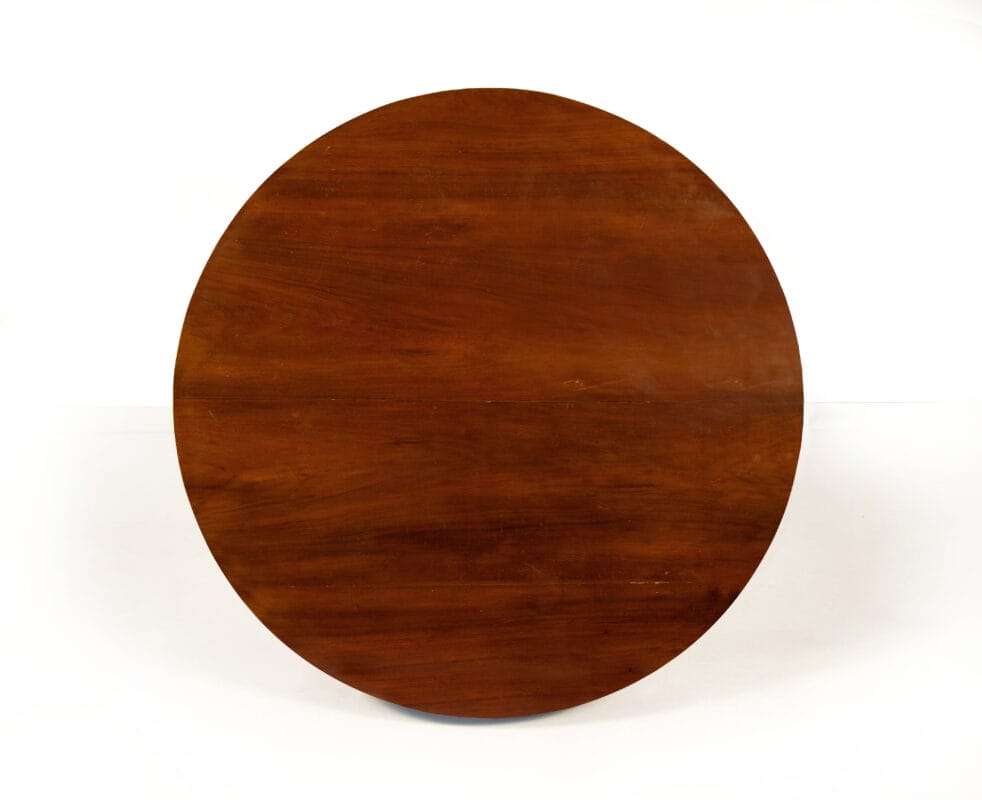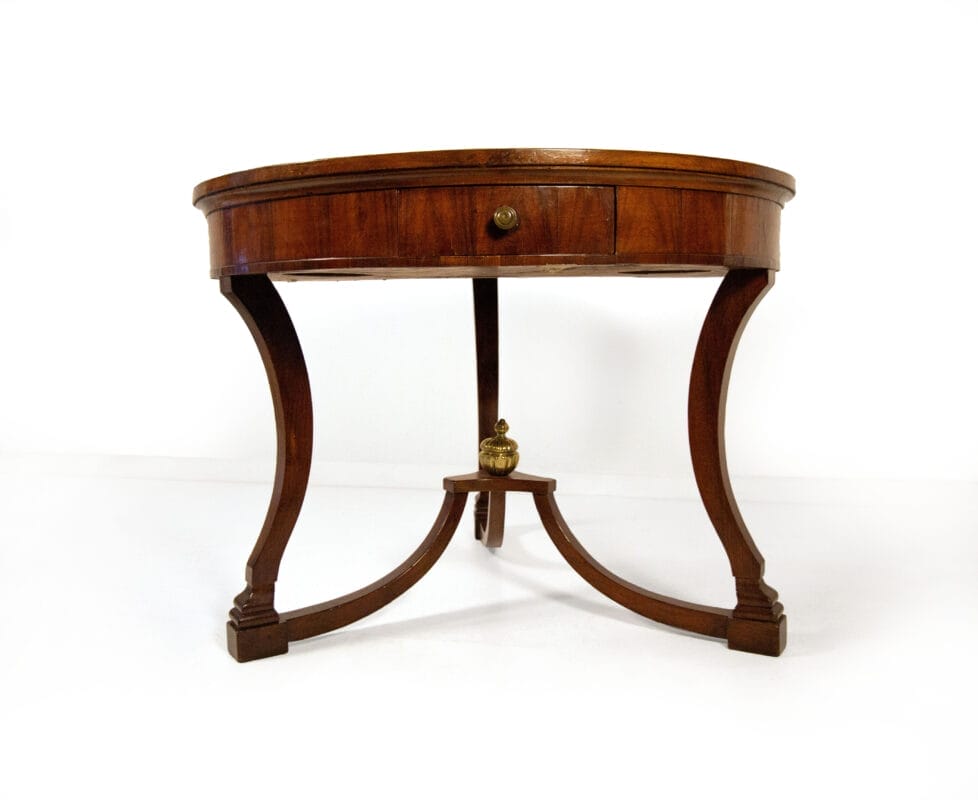 Tavolo lastronato in noce, XIX secolo, con piano circolare, cintura dritta a due cassetti, tre gambe a sciabola raccordate da traverse sagomate a centrare un pinnacolo in bronzo dorato, cm 80×110