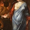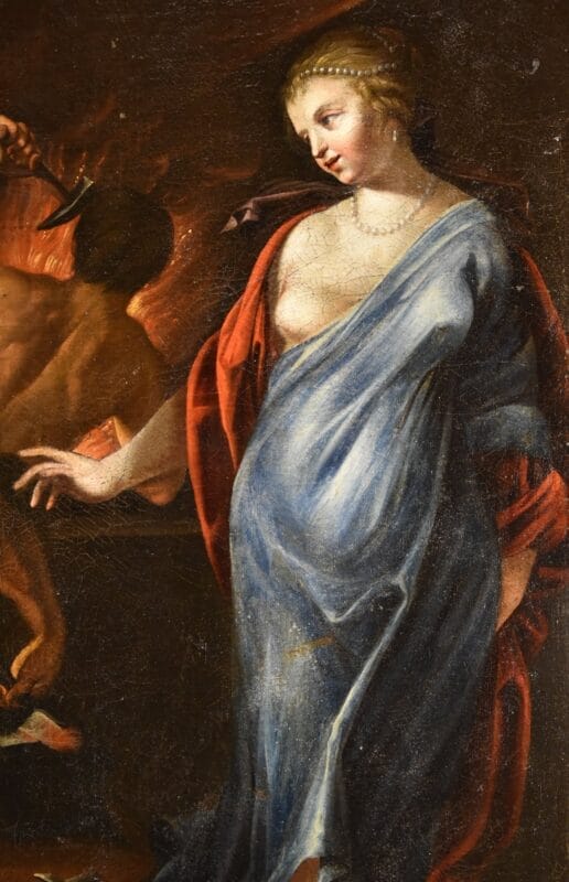 L’interessante dipinto proposto raffigura un celebre episodio mitologico narrato da Omero dell’Iliade (llibro XVIII) e ritrae Teti, la più bella fra le Nereidi e madre dell’eroe Achille, insieme ad Efesto, dio del fuoco e fabbro degli dei, che qui vediamo con un martello in mano intento a forgiare le armi per il figlio della donna, che diverranno emblema del grande potere dell’eroe.
