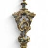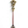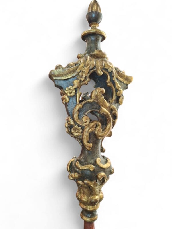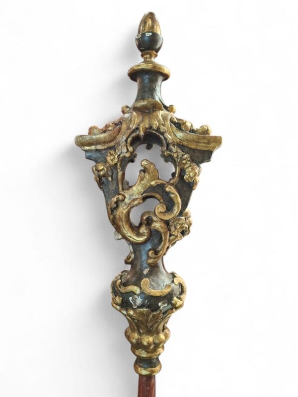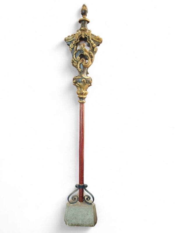 Tintinnabolo in legno intagliato dorato e laccato, con base in pietra e ferro, epoca XVII secolo, altezza complessiva 196 cm, la base ingombra 23×26 cm, senza campana.
