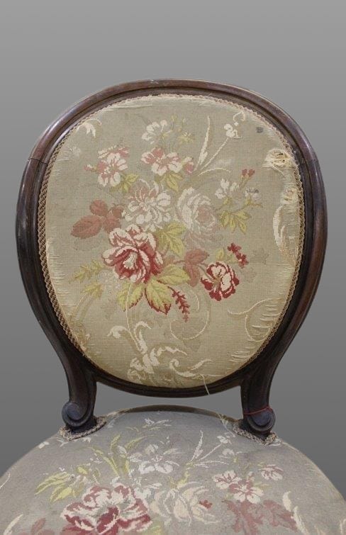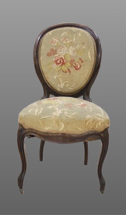 Sedia in palissandro con schienale a medaglione e gamba curva.