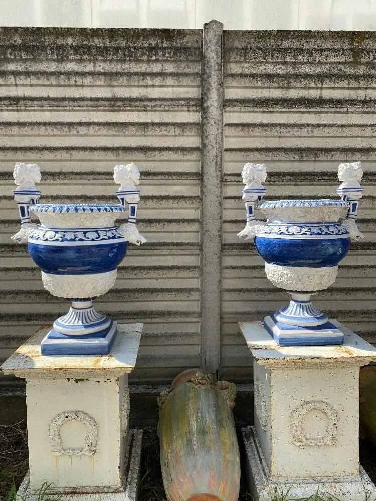 Coppia di vasi in porcellana dipinti in azzurro con manici raffiguranti i volti di maschio e femmina Le condizioni degli oggetti sono molto buone