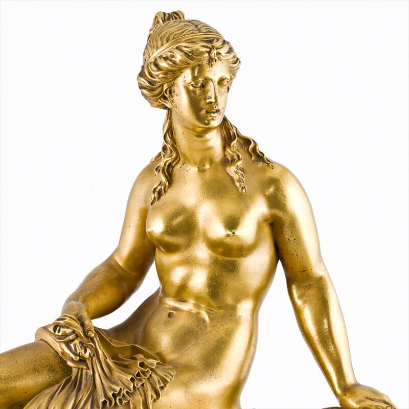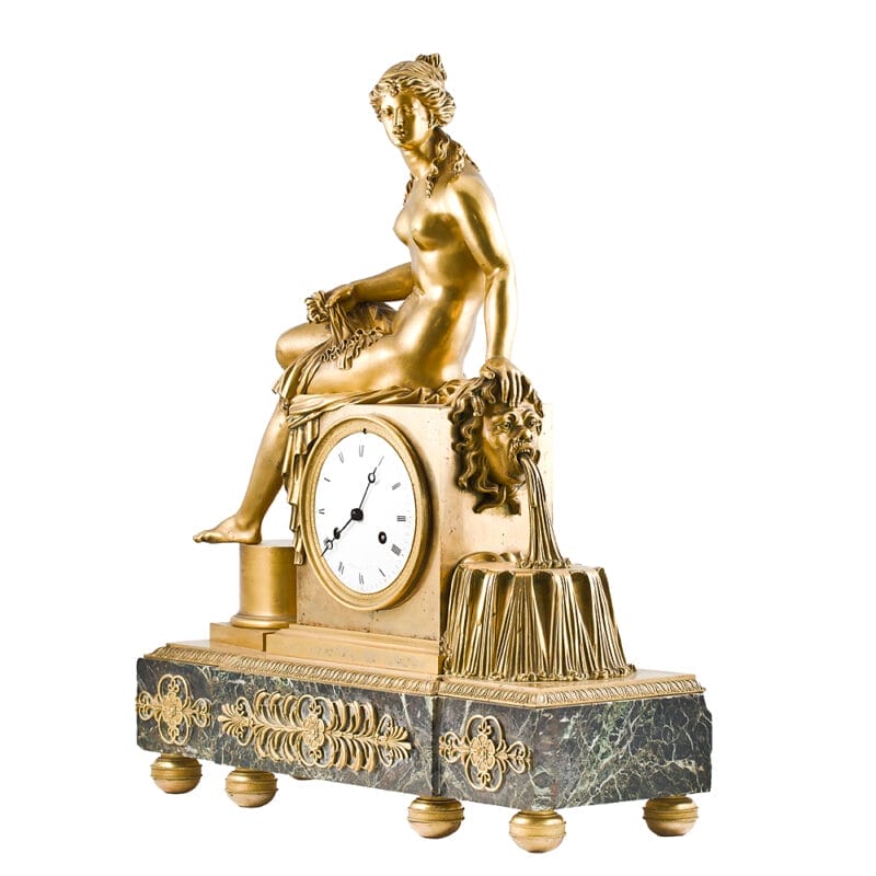 Importante e raffinato Orologio Impero dei primi dell’Ottocento, modello Thomire. L’opera presenta una sontuosa scultura in bronzo dorato raffigurante una figura femminile classica accanto a una fontana, esempio magistrale dell’estetica neoclassica francese.