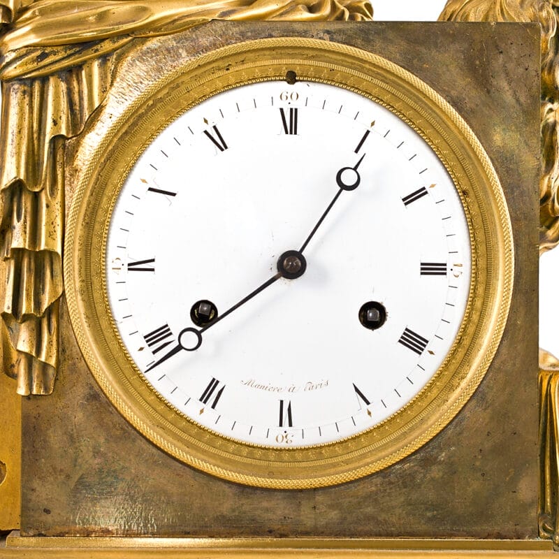 Il meccanismo a filo, di manifattura francese, testimonia l’alta qualità tecnica e artistica del periodo Impero, unendo precisione meccanica e bellezza scultorea in un equilibrio di grande eleganza.