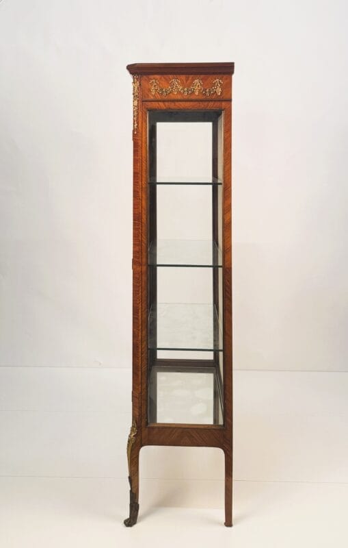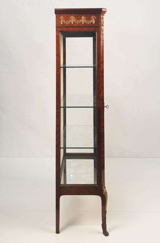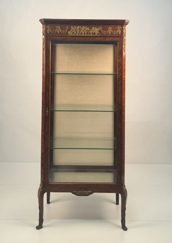 Vetrina impiallacciata in bois de rose, Francia, fine XIX – inizi del XX secolo, arricchita da fregi in bronzo dorato, fronte e fianchi in vetro, fascia superiore decorata da una danza di putti tra ghirlande di fiori ripetute sui fianchi un fregio a trofei musicali agli angoli, gambe arcuate terminanti in scarpette metalliche.
