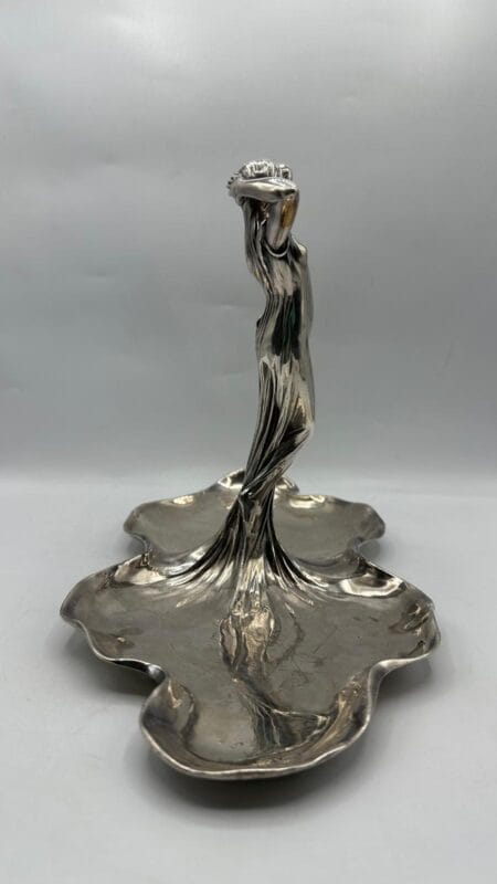 Centro tavola art nouveau domestic metalwork wmf, raffigurante una giovane donna in movenze sinuose la cui veste va a formare i due piatti all’estremità epoca 1906c fabbricazione tedesca, metallo argentato