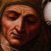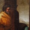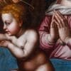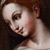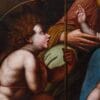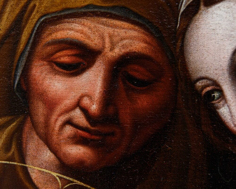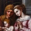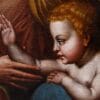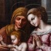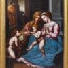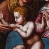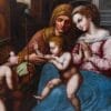 L’opera è impostata sullo schema iconografico della Sacra Famiglia con Sant’Elisabetta e San Giovannino, una tipologia che Raffaello aveva già esplorato con successo (si veda ad esempio la Sacra Famiglia Canigiani presso la Alte Pinakothek), raggiungendo qui l’apice della sintesi. La composizione, costruita su un modello piramidale tipicamente rinascimentale, vede le cinque figure raccolte in un ambiente architettonico scuro e solenne, in stile classicheggiante, con un’apertura sullo sfondo che rivela un paesaggio appena accennato. La Vergine Maria, seduta in primo piano a sinistra, con le mani giunte in una posa di tenera contemplazione sorregge sulle ginocchia il Bambino, quest’ultimo proteso in un gesto dinamico e benedicente verso il San Giovannino, inginocchiato sulla sinistra inginocchiato mentre porge la sua croce astile, simbolo del futuro sacrificio di Cristo, in un gesto di profetica preghiera o offerta. L’interazione tra i bambini, con la croce come fulcro visivo, conferisce al dipinto un intimo significato teologico: l’incontro tra i cugini anticipa e simboleggia, infatti, il futuro sacrificio e la Passione di Cristo. Dietro questo primo gruppo centrale appare l’anziana Santa Elisabetta che, intenta a reggere il Bambino, crea con la sua presenza un triangolo compositivo che dona un ulteriore piano di profondità emotiva alla scena. Infine, l’artista sceglie di mostrarci anche un San Giuseppe defilato, posto sullo sfondo in posizione eretta e quasi nascosta, che osserva la scena attraverso un’apertura architettonica enfatizzando la sua funzione di custode silenzioso e testimone del mistero divino. Nel dipinto qui presentato, l’uso di una palette cromatica intensa – in particolare il rosa vivo del manto della Vergine, il blu saturo delle sue vesti e i toni terrosi delle figure più anziane – e la gestione della luce, che enfatizza le carni morbide dei bambini ed i volti intensi, suggeriscono una datazione nel XVII secolo, forse nell’ambito della pittura devozionale italiana o di una scuola regionale influenzata dai grandi maestri del Cinquecento, nonostante venga pienamente rispettata l’armonia formale raffaellesca. Al di là dell’elevata qualità stilistica, l’opera si distingue per l’intensa carica emotiva: gli sguardi ed i gesti, in particolare quello di Sant’Elisabetta e di San Giuseppe sullo sfondo, suggeriscono una meditazione sul destino dei due bambini, inserendo un elemento di solitudine e consapevolezza del sacrificio divino in un’atmosfera altrimenti serena. L’opera è, in definitiva, un esempio fondamentale per far rivivere la pittura romana di Raffaello, che coniuga la perfezione formale del Classicismo con una crescente sensibilità per la narrazione emotiva e la monumentalità delle forme.